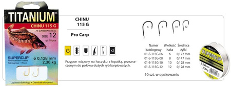 Doskonałe haki i doskonała żyłka precyzyjnie zawiązane dają wędkarzowi komfort nad wodą. Przypon z hakami Robinson Titanium® gwarantuje pewność zacięcia i pewność trzymania ryby w czasie holu. Zastosowana żyłka Robinson Supercup® jest niesłychanie wytrzymała. Haki są perfekcyjnie dobrane do przynęt najczęściej stosowanych na dany gatunek ryby. Przypon ma długość 70 cm, a średnice zastosowanej żyłki wynoszą od 0,115 mm do 0,218 mm. Pokryta fluorocarbonem żyłka Supercup® jak i haki były wielokrotnie testowane przez Mistrzów Polski – członków klubu Robinson Team.